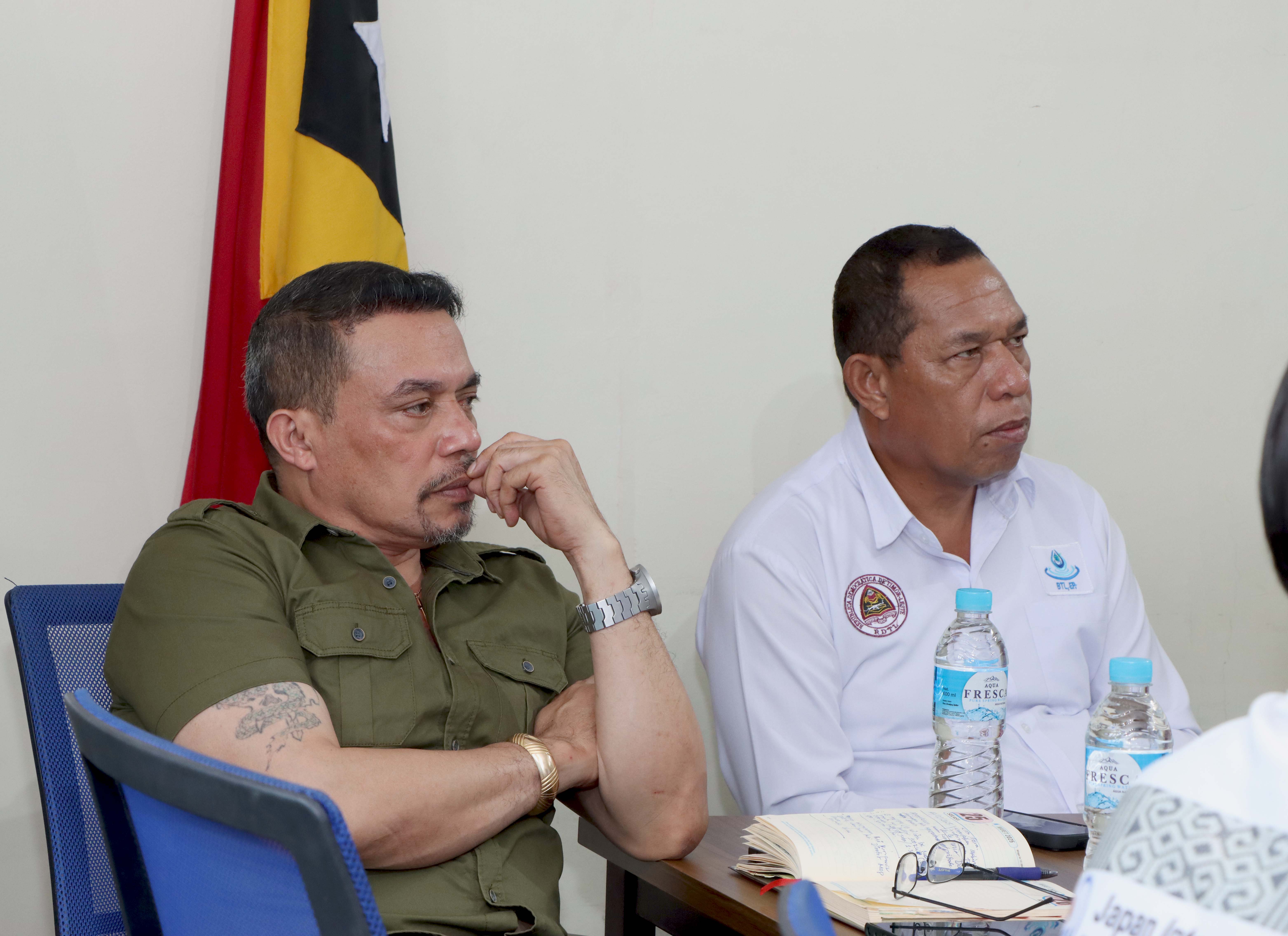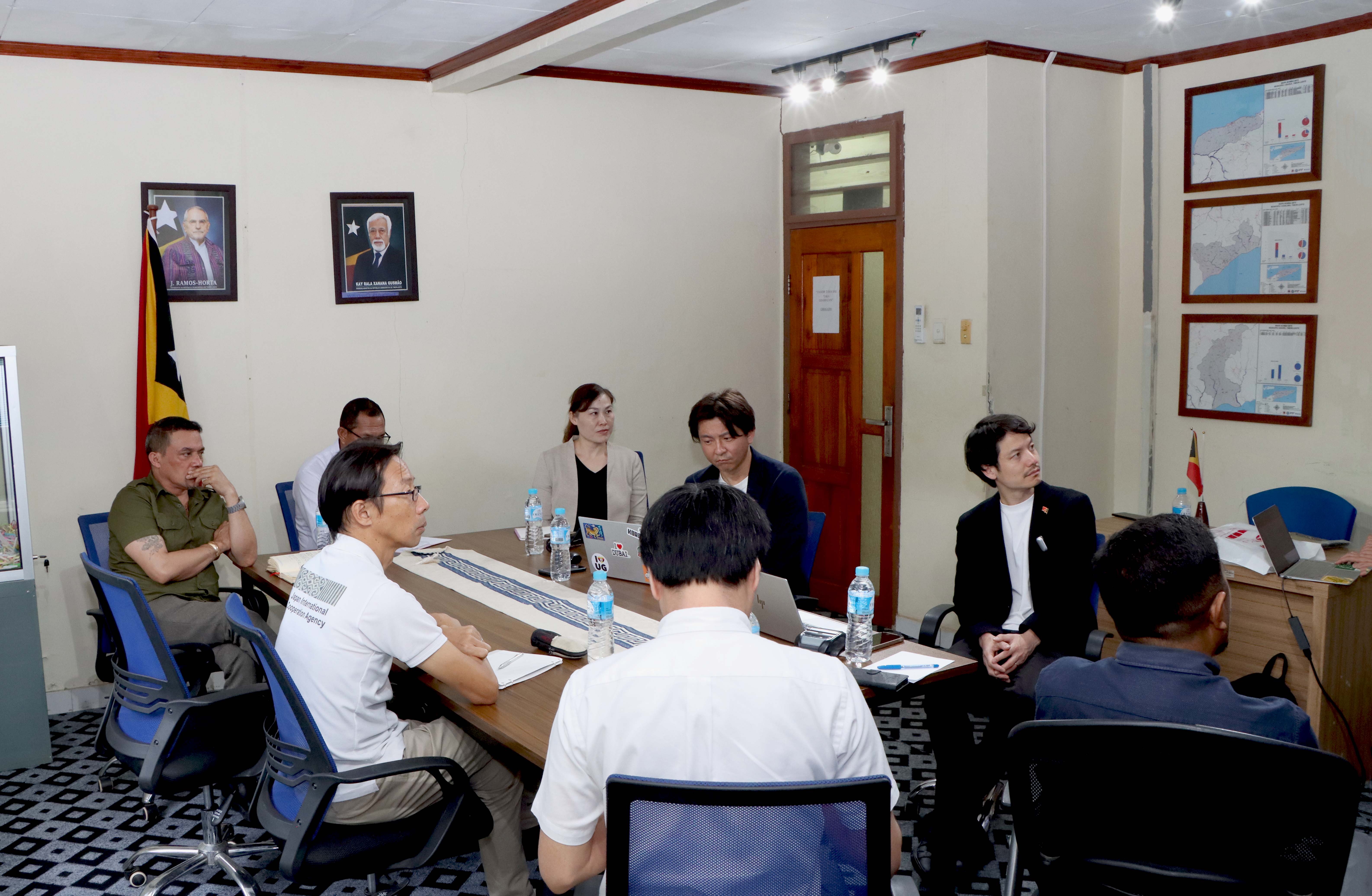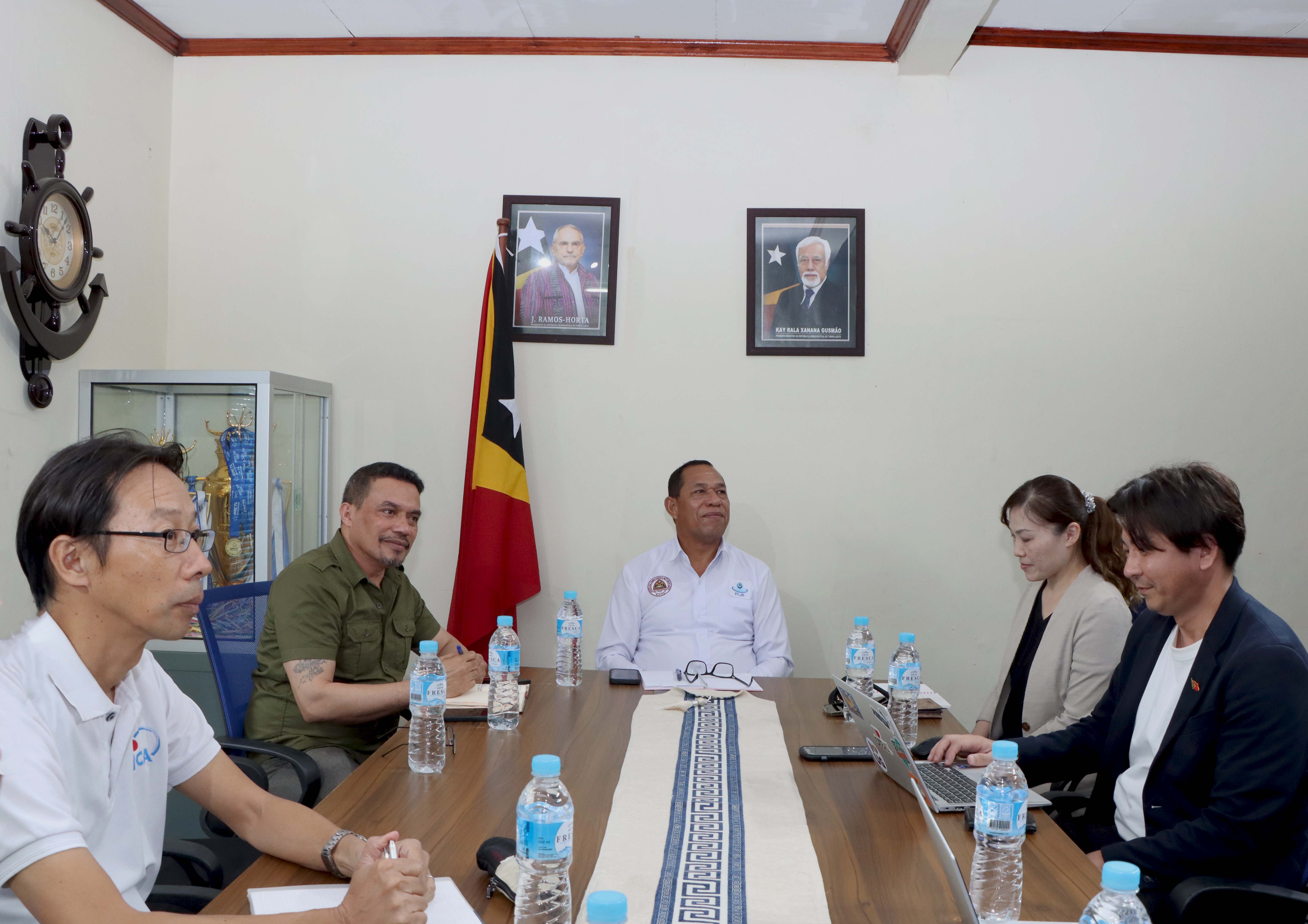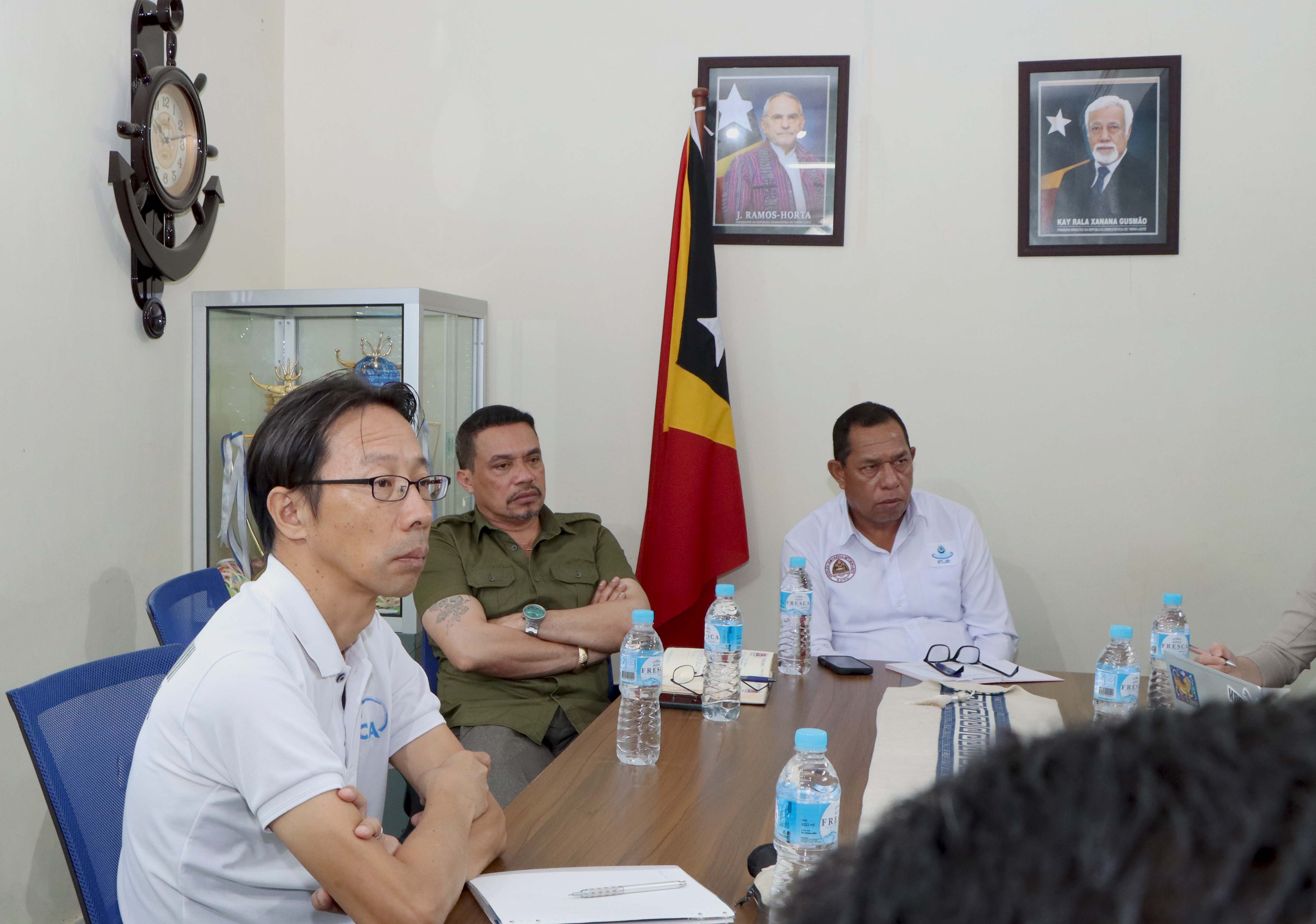 Díli, 09 Marsu 2026. Prezidente Komisaun Ezekutiva (KE) Bee Timor-Leste, Empreza Públika (BTL, E.P), Gustavo da Cruz ho Vise-Prezidente KE BTL, E.P ba Asuntu Korporativu, Manuel Tomas Amaral de Carvalho, simu vizita no enkontru ho ekipa hosi JICA ๐ป๐๐๐๐๐ข๐๐๐ก๐๐ no JICA Timor-Leste inklui empreza NEOS hosi Japaun, iha sala reuniaun Ezekutivu BTL, E.P sentrál, Caicoli.