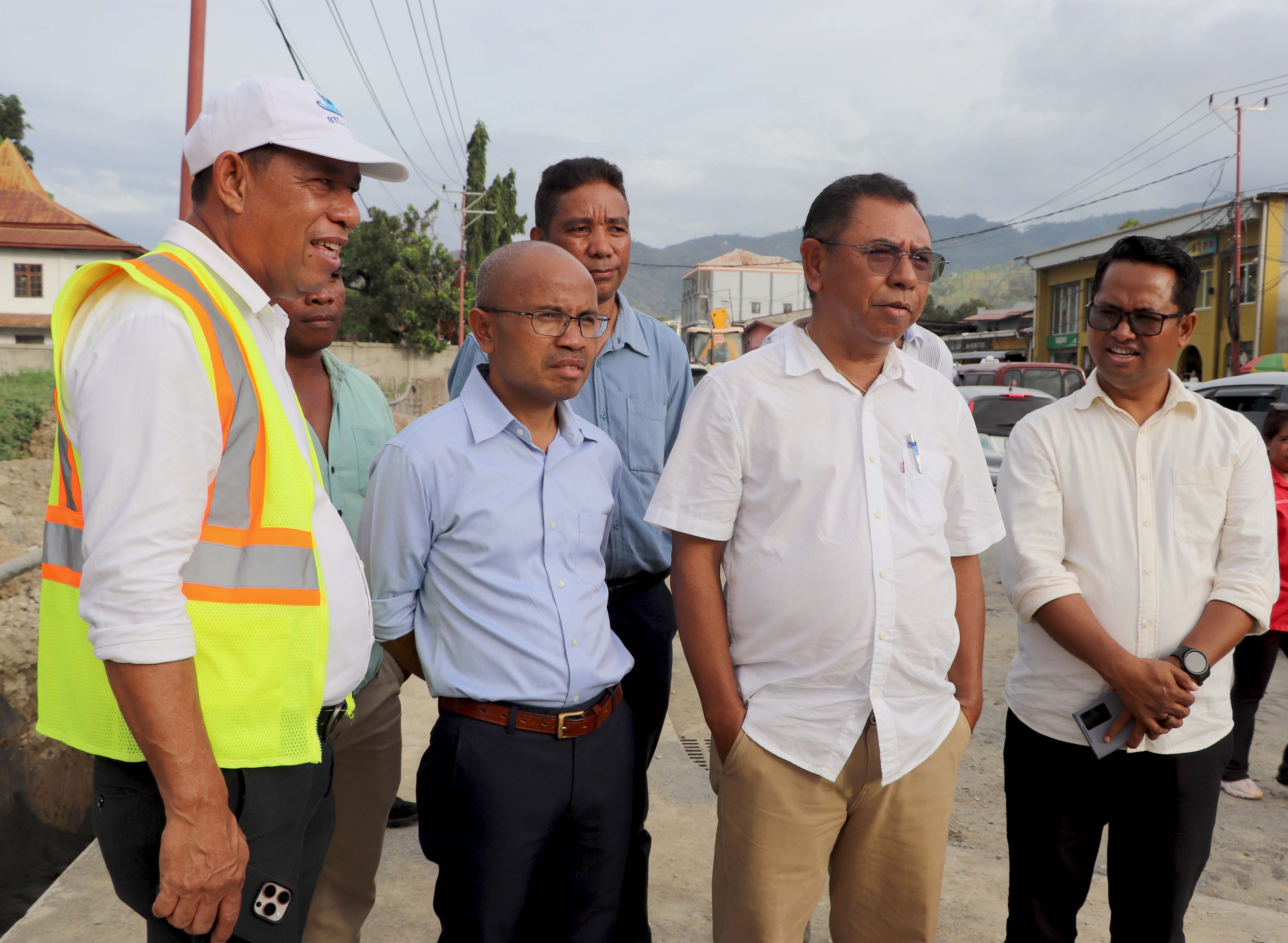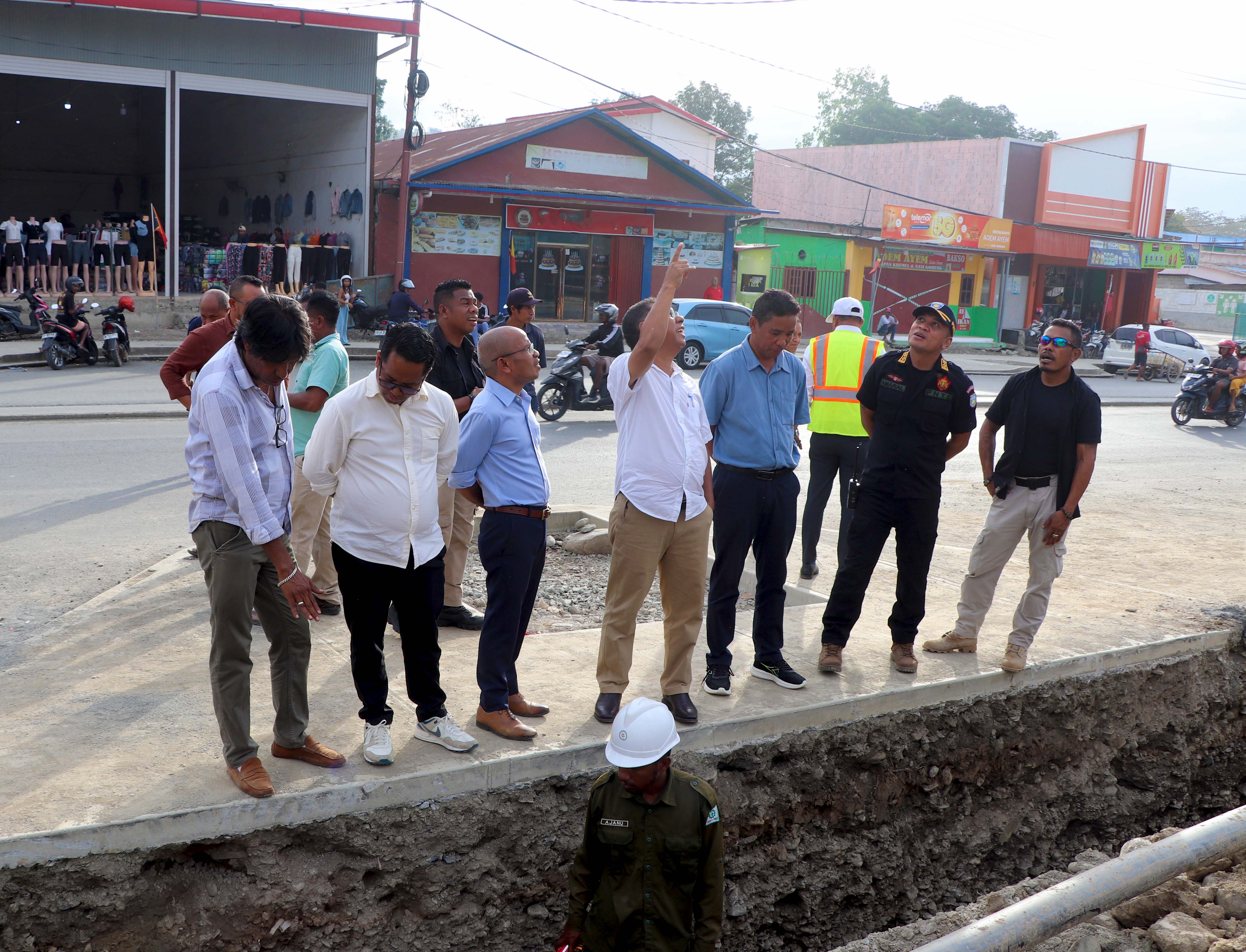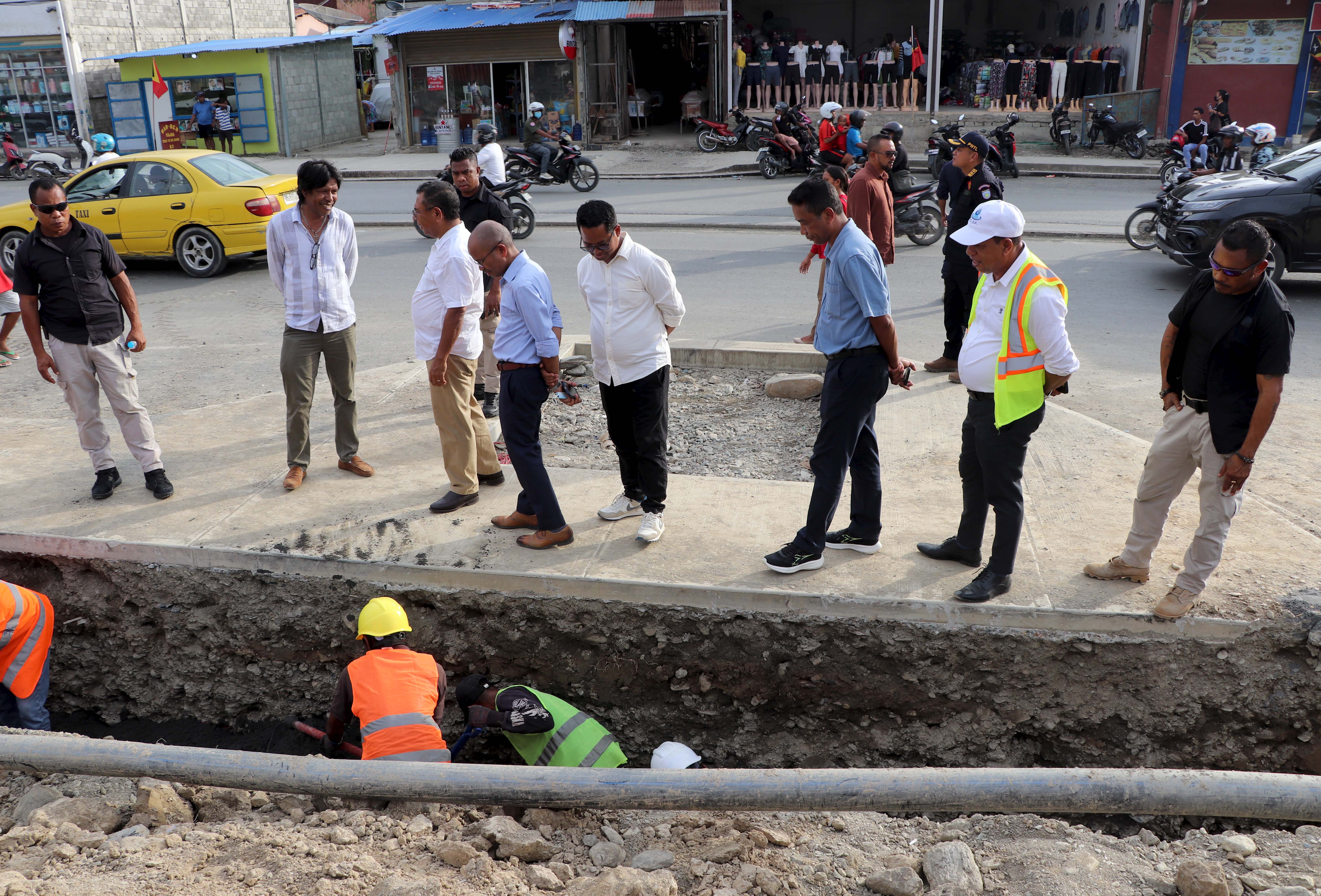 Díli, 18/11/2026. Prezidente Komisaun Ezekutiva Bee Timor-Leste, Empreza Públika (BTL, E.P), Gustavo da Cruz ho Diretór João da Cruz Cardoso no Jestór Infraestrutura hamutuk ho Prezidente Komisaun EDTL, E.P ho ekipa akompaña S.E Ministru Obras Públikas (MOP), Samuel Marçal, halo monitorizasaun ba implementasaun projetu pilotu konstrusaun kabu eletrisidade ๐‘†๐‘ข๐‘๐‘ก๐‘’๐‘Ÿ๐‘Ÿ๐‘Ž๐‘›๐‘’ฬ‚๐‘œ, iha diresaun Culuhun bá Becora.