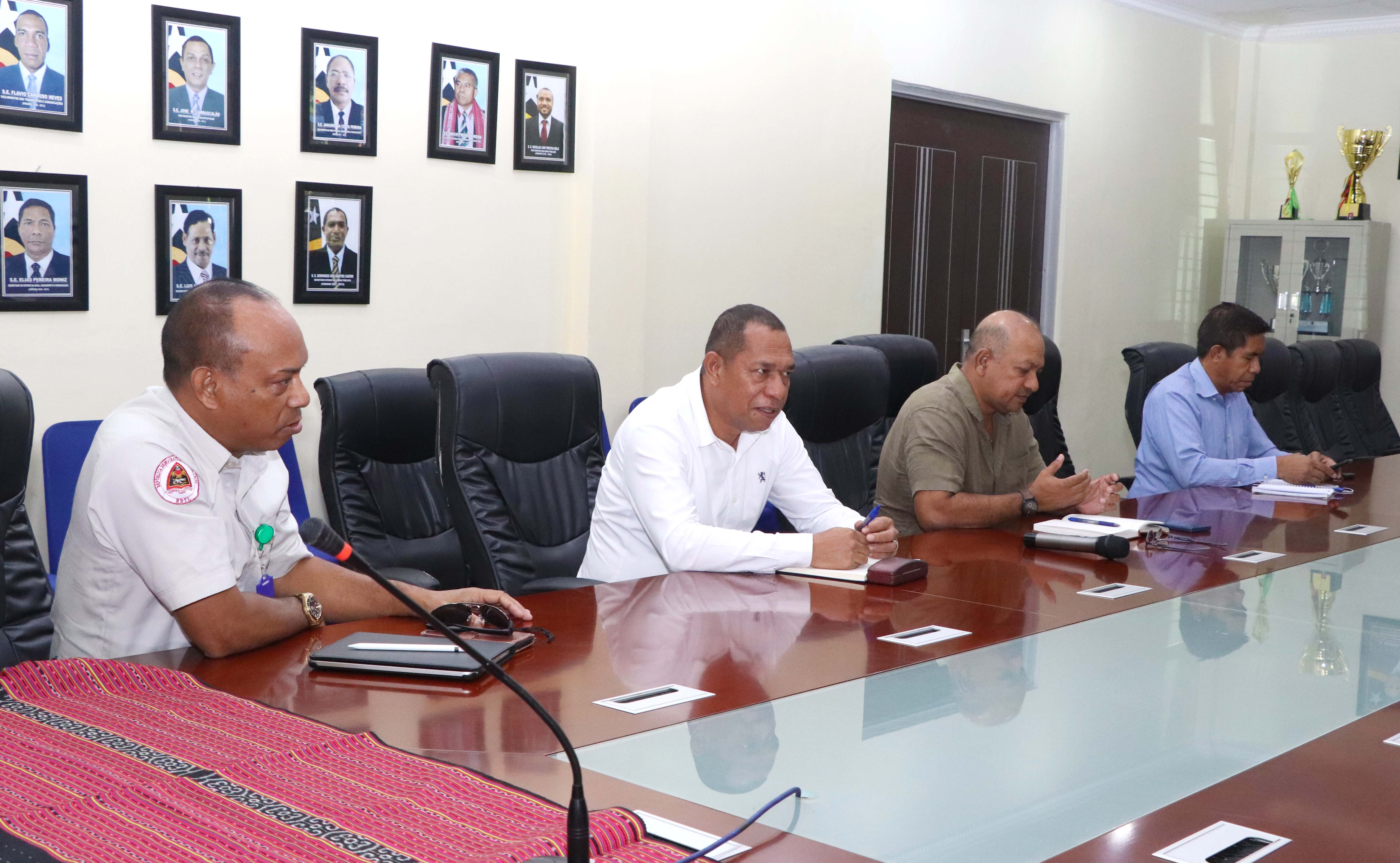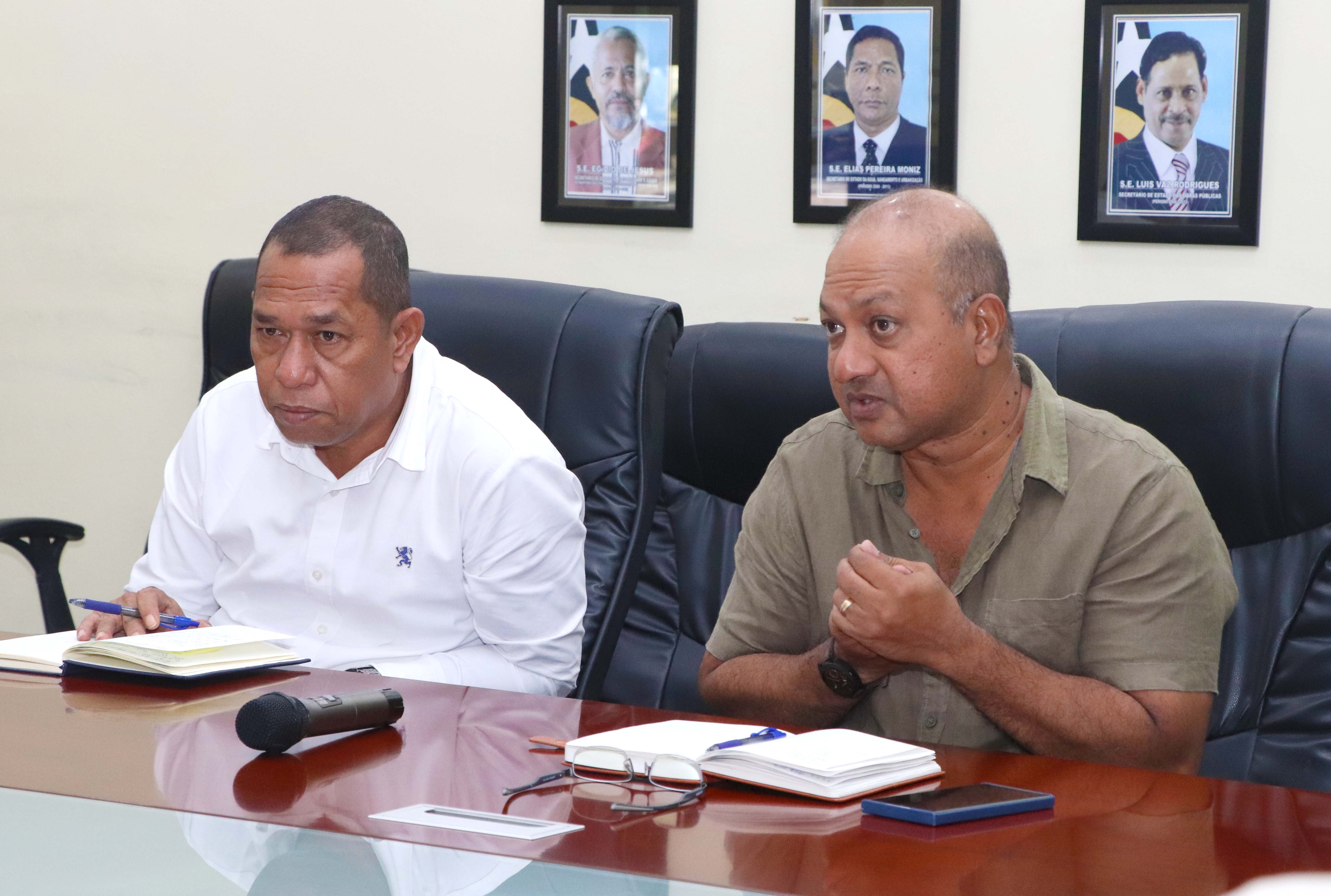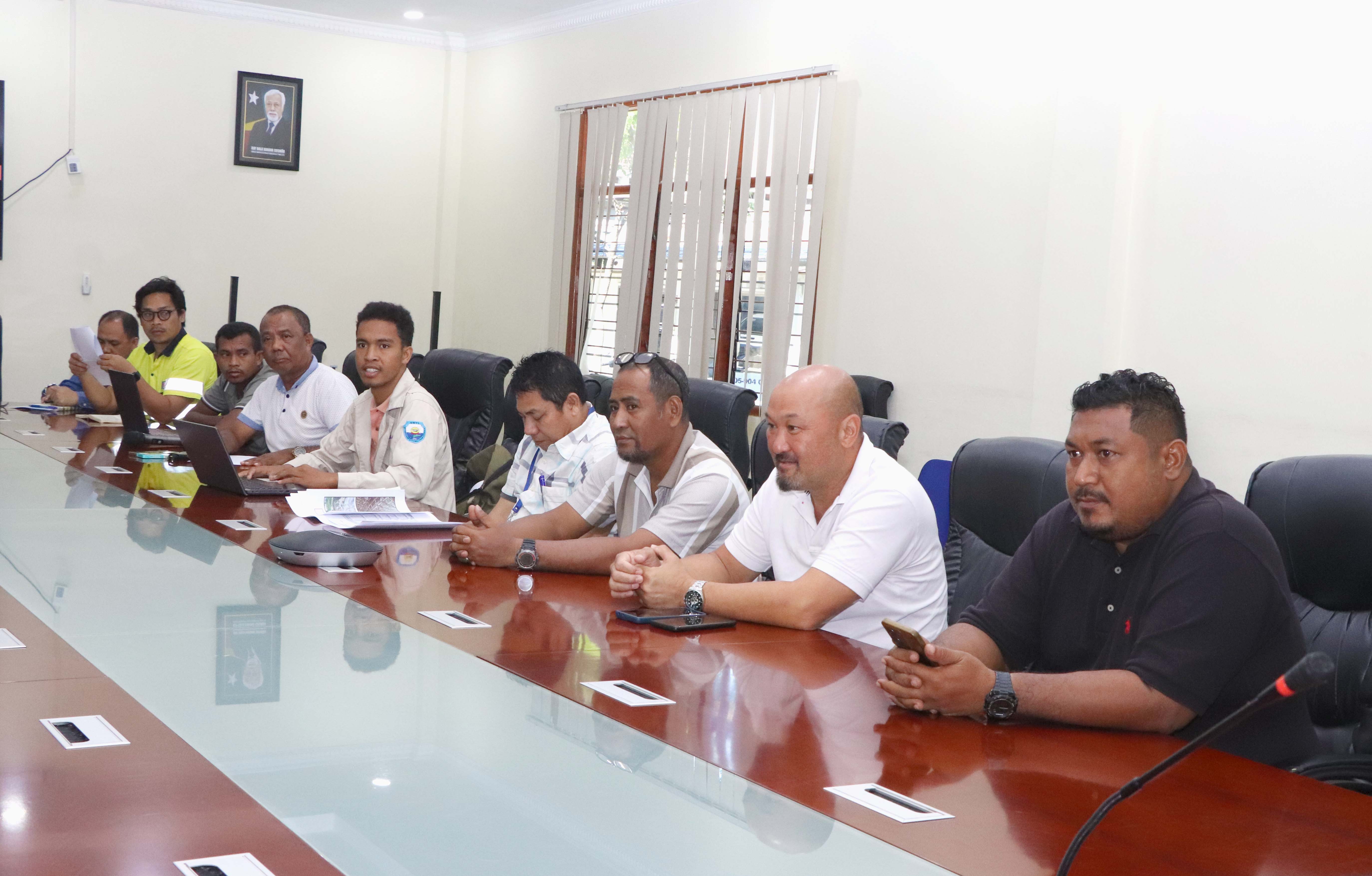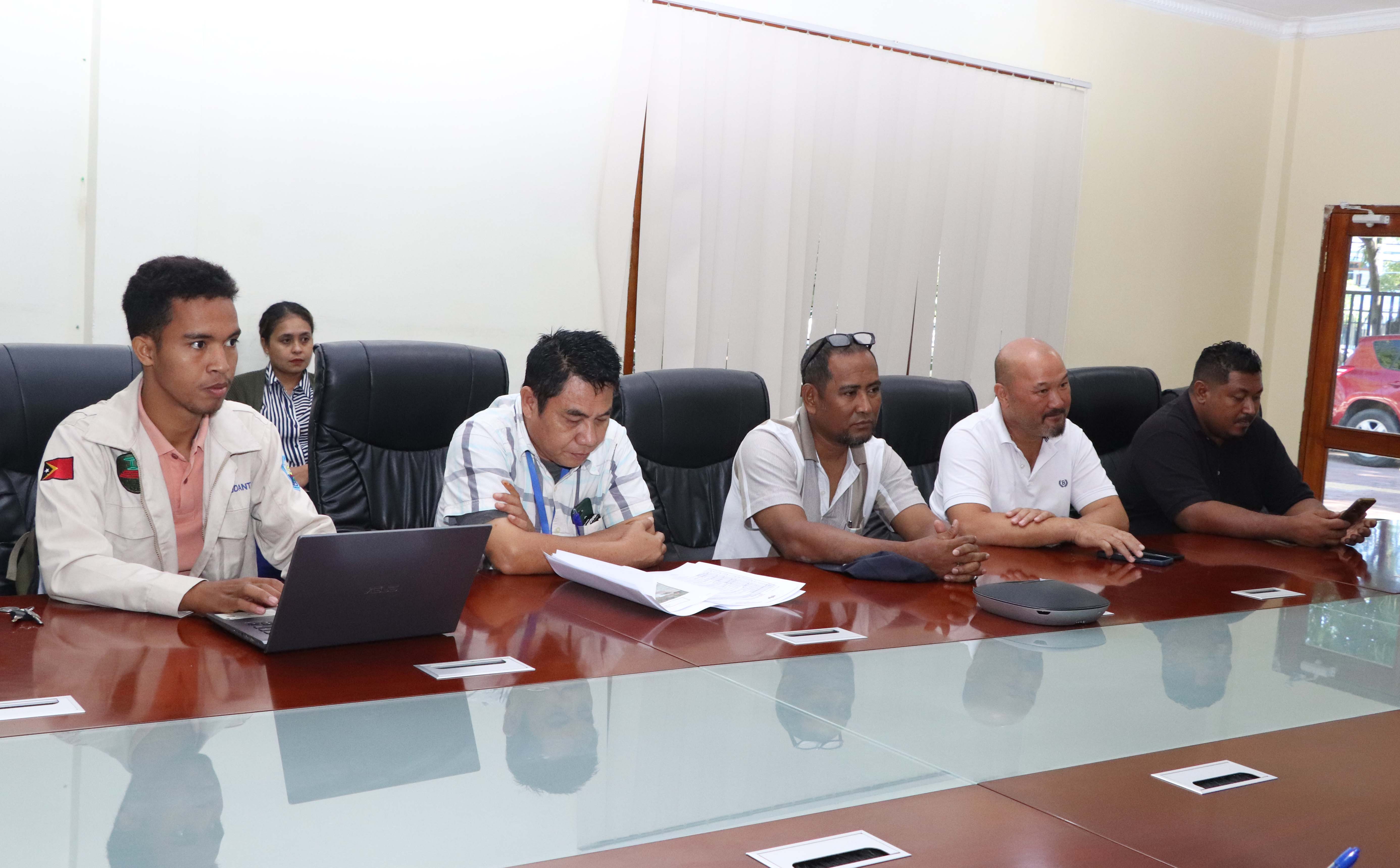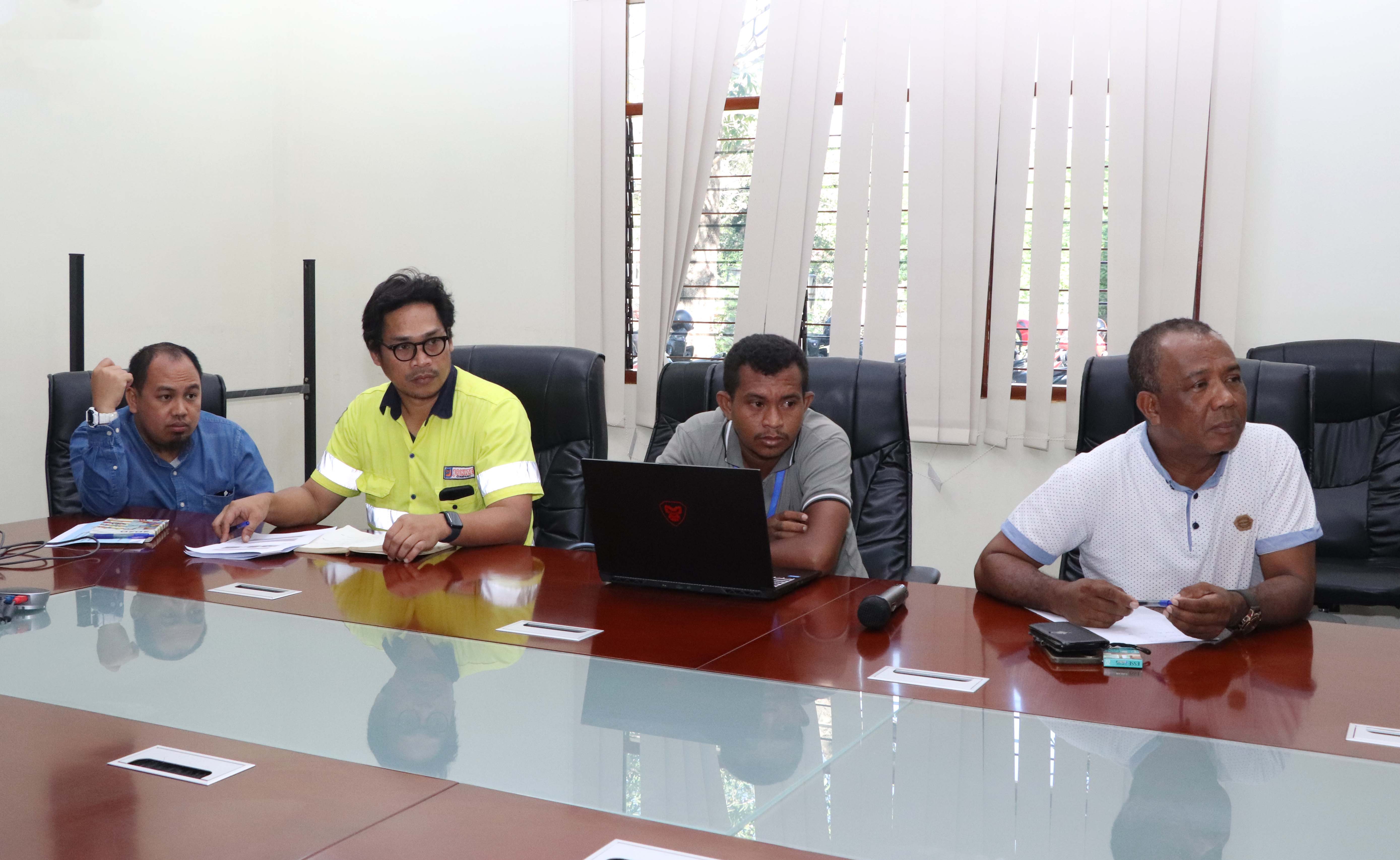 Díli, 03/06/2024, Vise-Prezidente Komisaun Ezekutiva Bee Timor-Leste, Empreza Públika (BTL, E.P) ba Asuntu Sistema Bee, Saneamentu no Drenajen, Gustavo da Cruz akompaña hosi Diretór Operasaun no Manutensaun (DOM) Aleixo dos Santos hamutuk ho parte Diresaun-Jerál Estrada, Ponte Prevensaun no Kontrolu ๐ถโ๐๐๐๐ (DGEPPCC, sigla portugés) ne’ebé hola parte iha ekipa Brigada Intervensaun Rápida (BIR) enkontru rutina ho kompañia implementadór sira, iha salaun enkontru Ministériu Obras Públika (MOP), Caicoli.