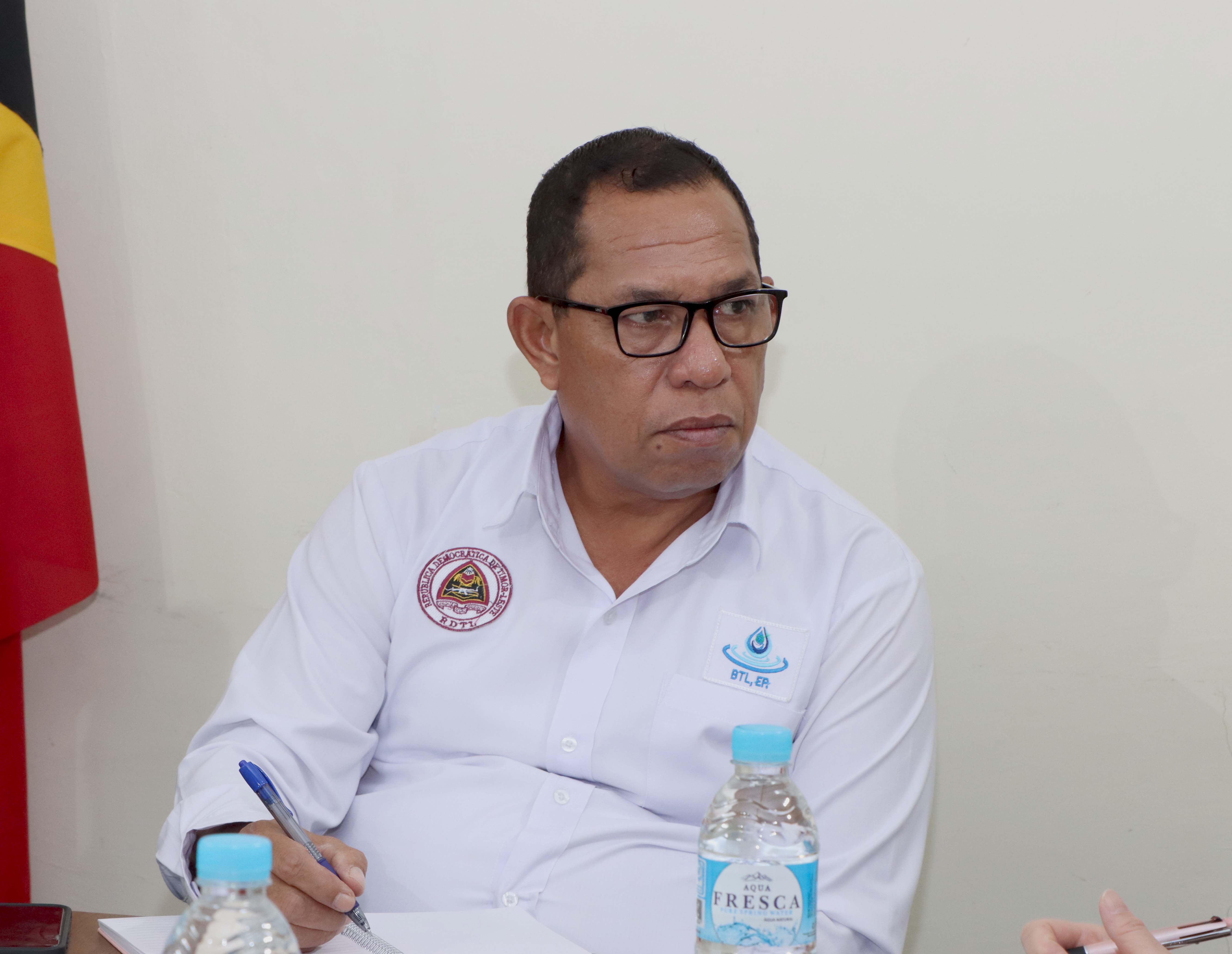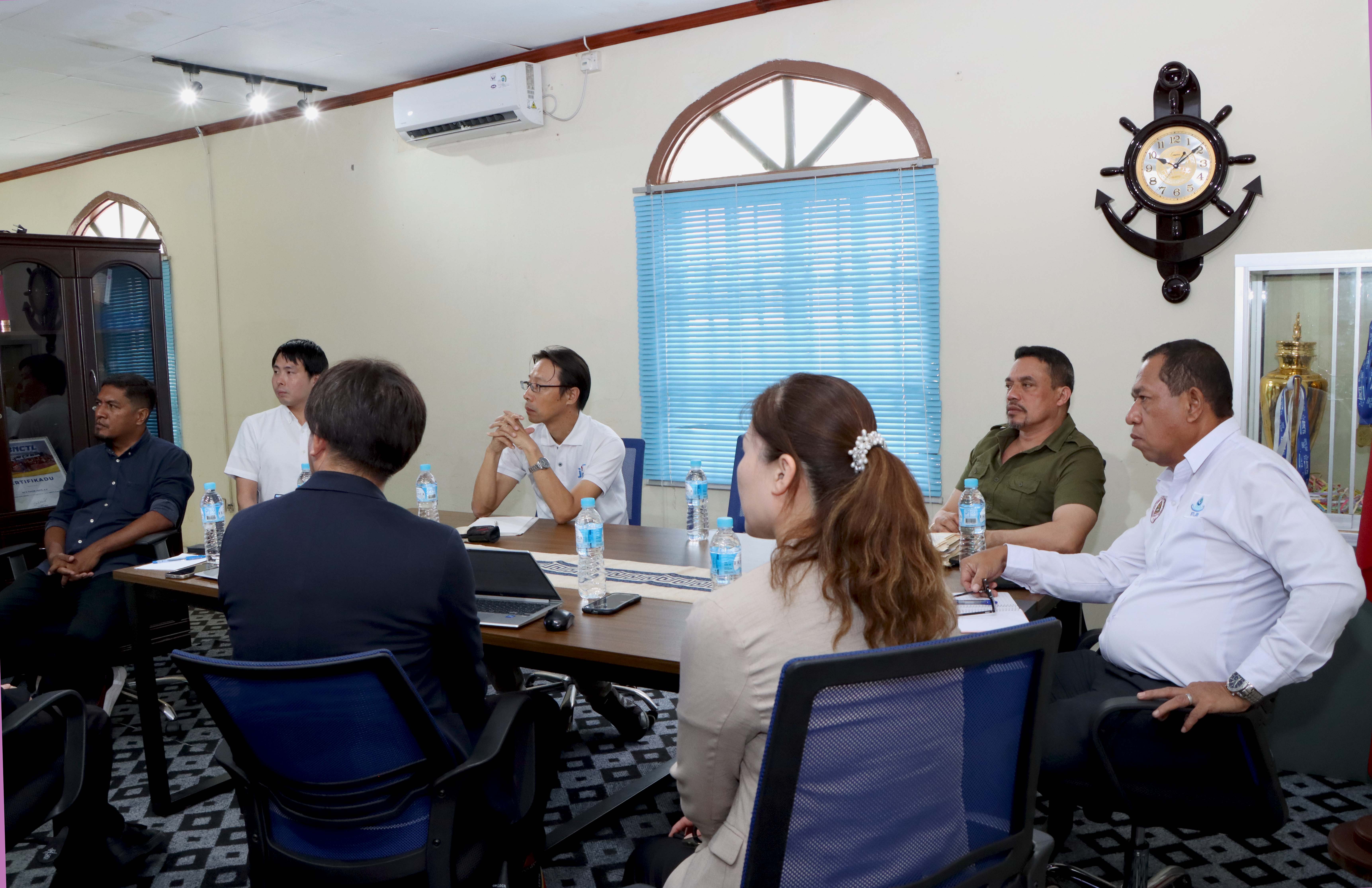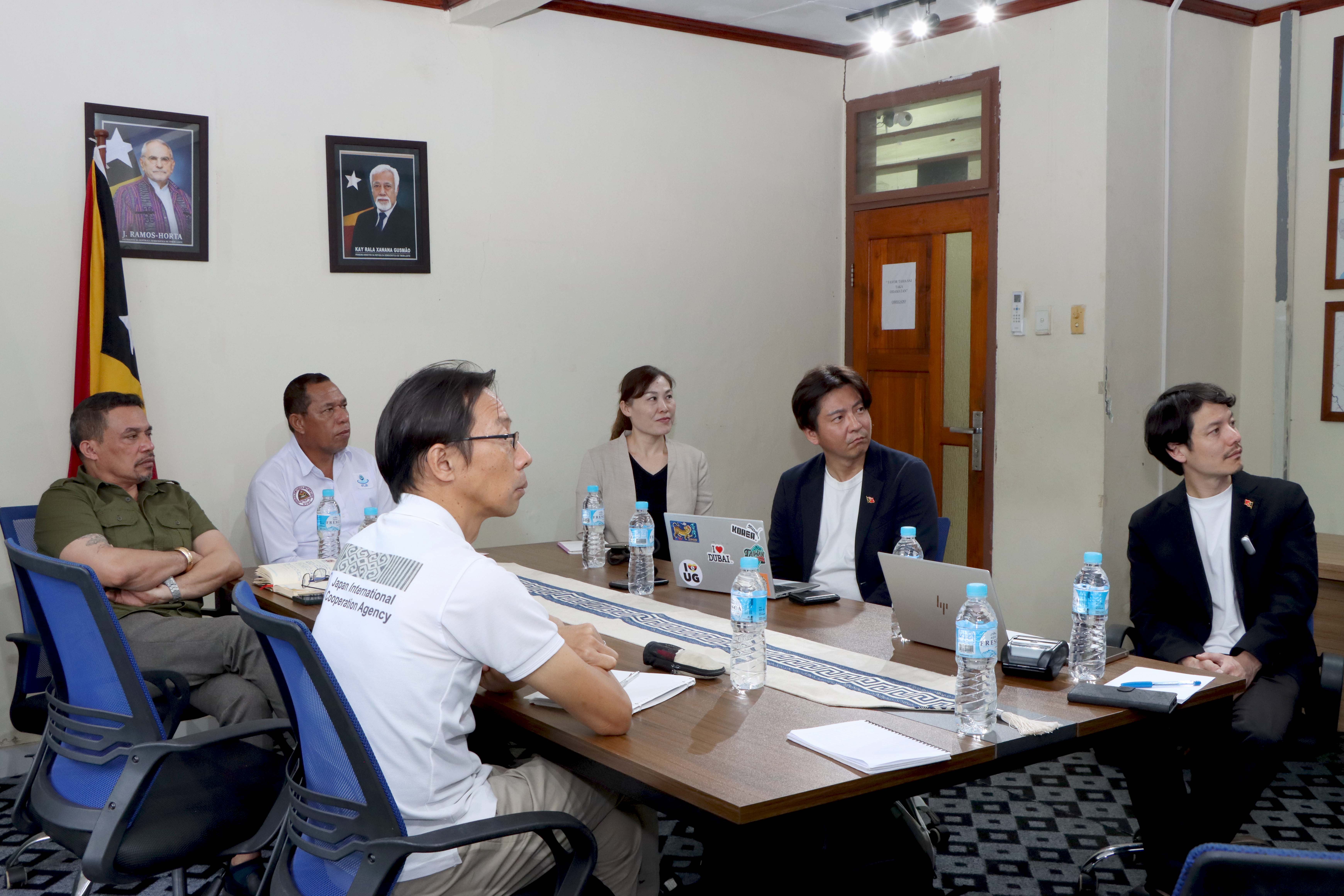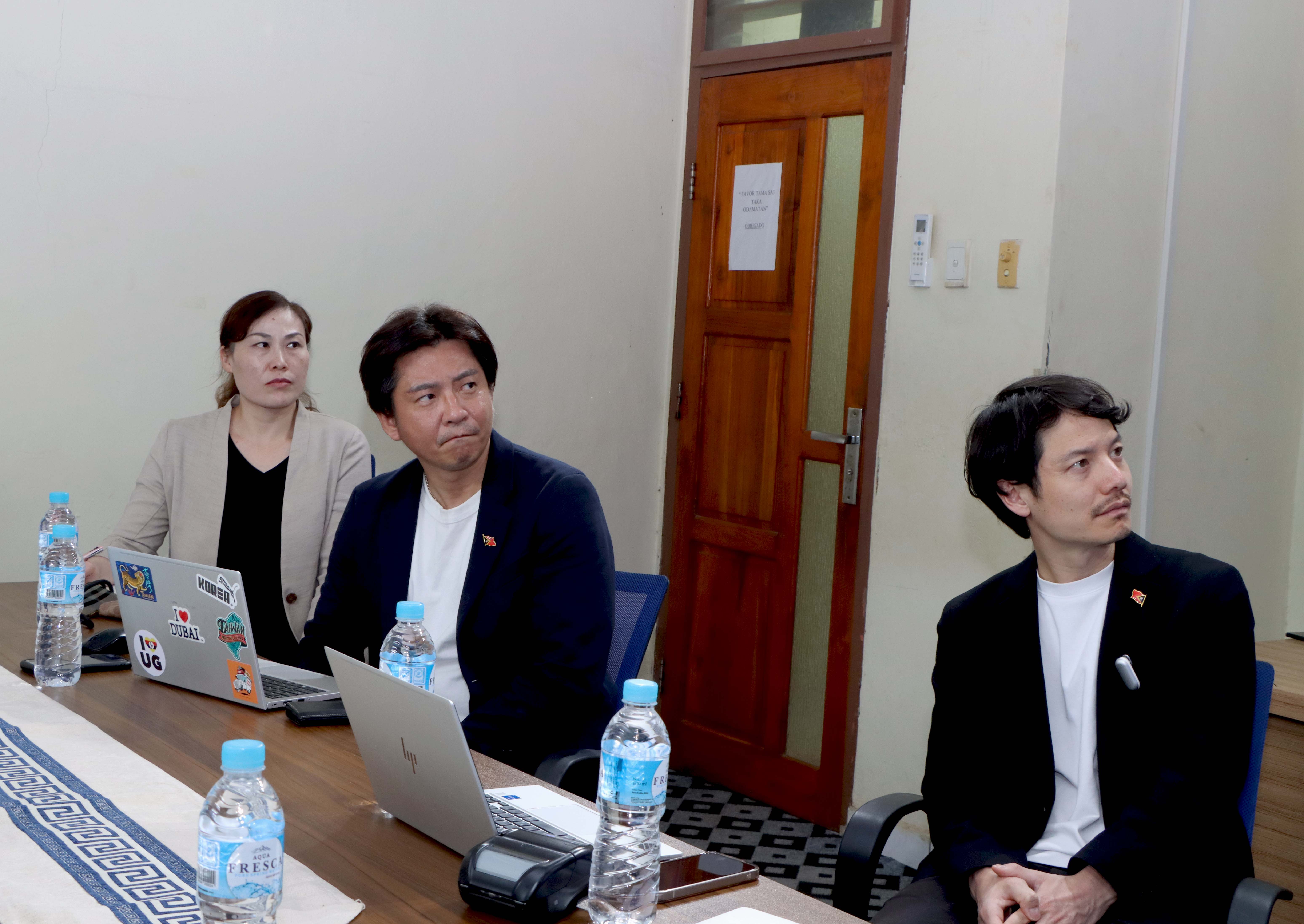 𝐃𝐢́𝐥𝐢, 𝟎𝟗 𝐌𝐚𝐫𝐬𝐮 𝟐𝟎𝟐𝟔. Prezidente Komisaun Ezekutiva (KE) Bee Timor-Leste, Empreza Públika (BTL, E.P), Gustavo da Cruz ho Vise-Prezidente KE BTL, E.P ba Asuntu Korporativu, Manuel Tomas Amaral de Carvalho, simu vizita no enkontru ho ekipa hosi JICA 𝐻𝑒𝑎𝑑𝑞𝑢𝑎𝑟𝑡𝑒𝑟 no JICA Timor-Leste inklui empreza NEOS hosi Japaun, iha sala reuniaun Ezekutivu BTL, E.P sentrál, Caicoli.