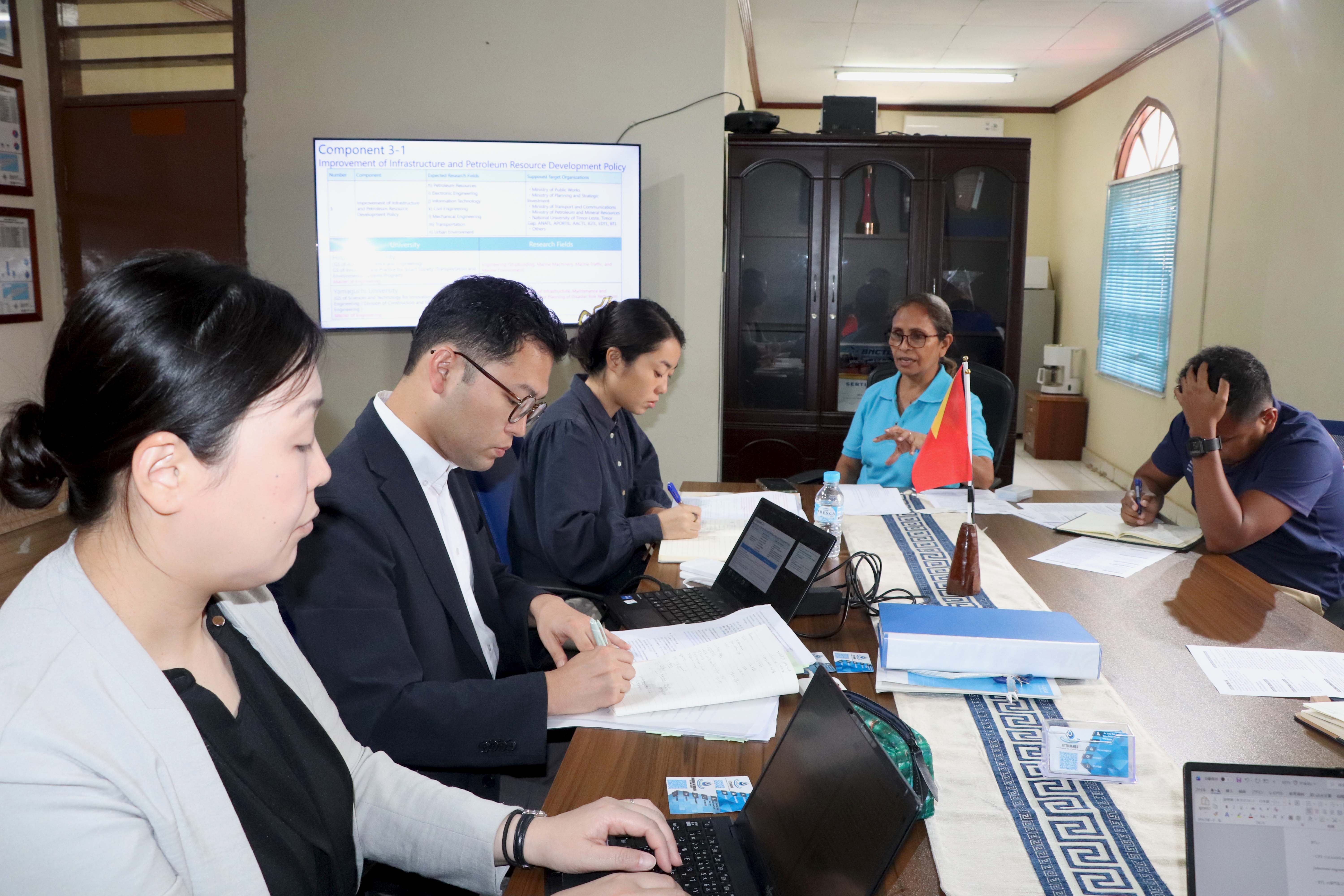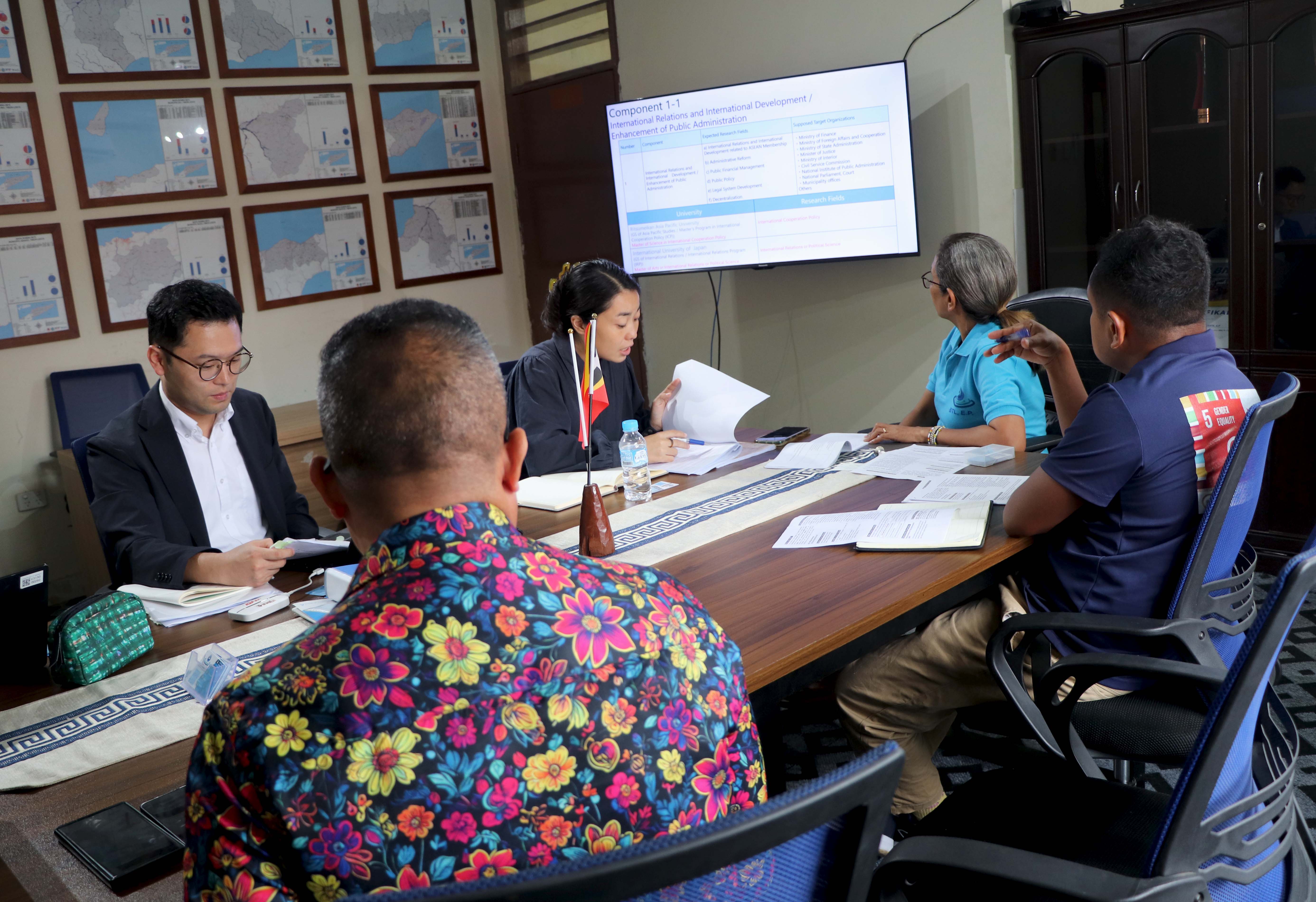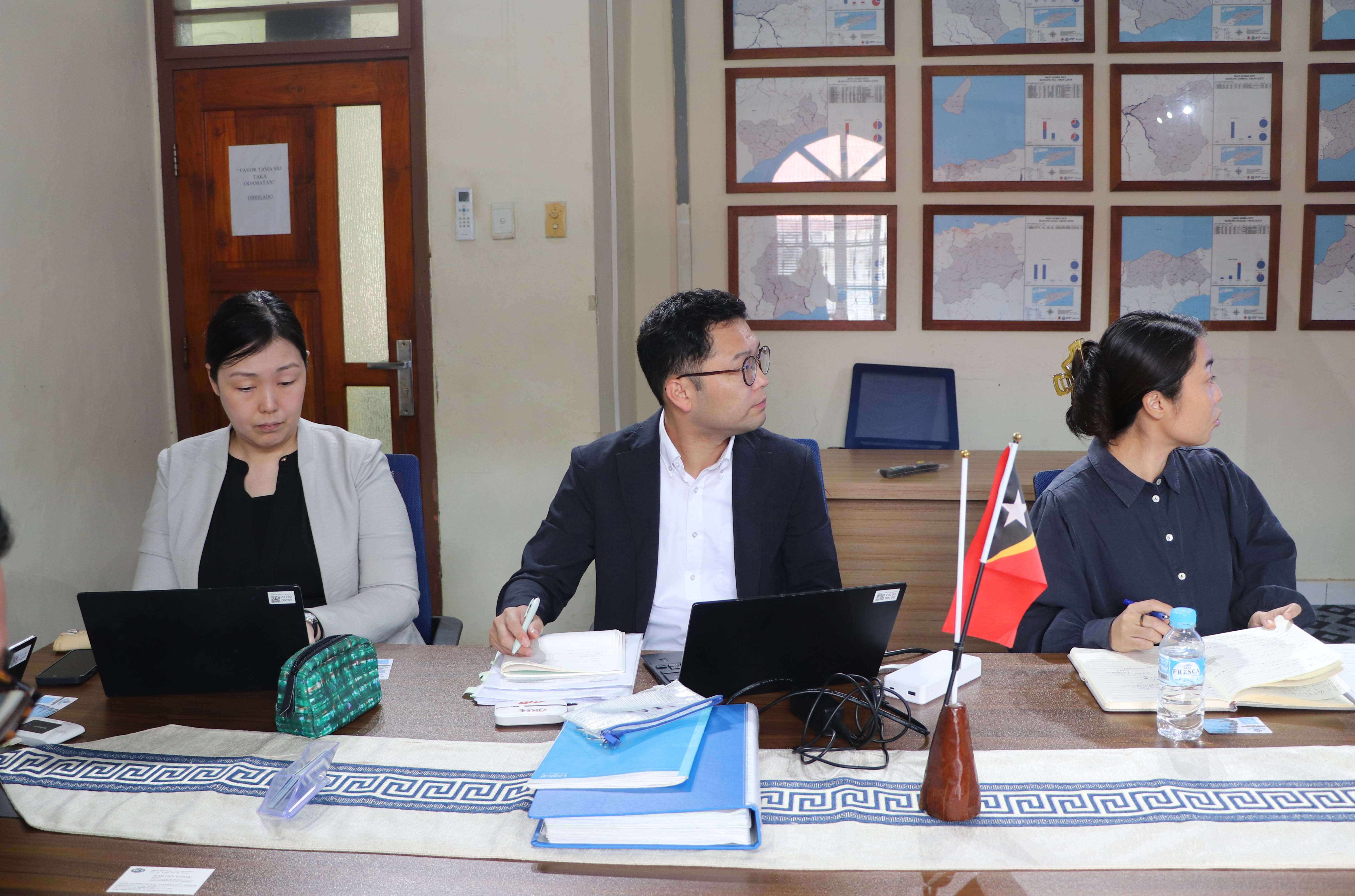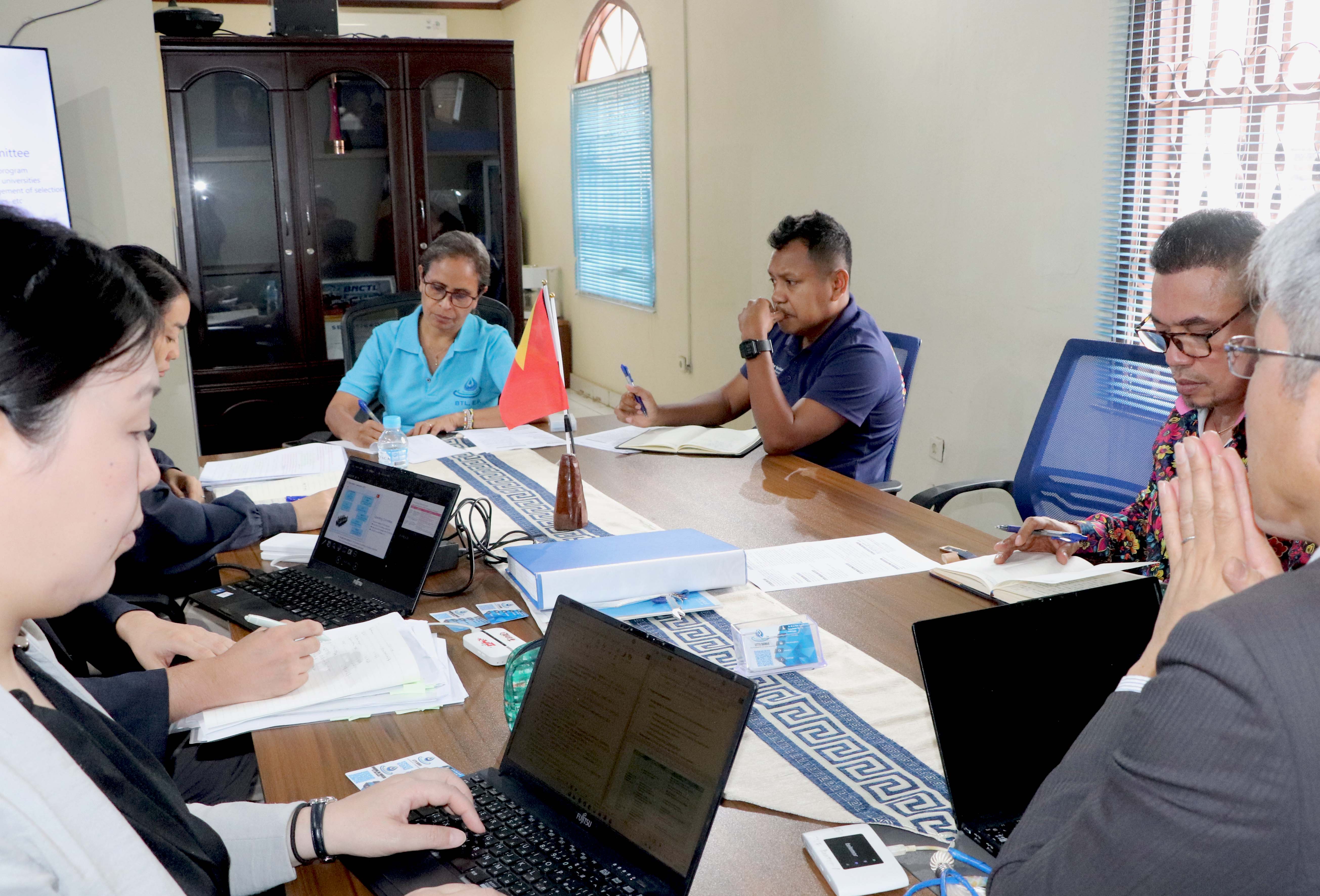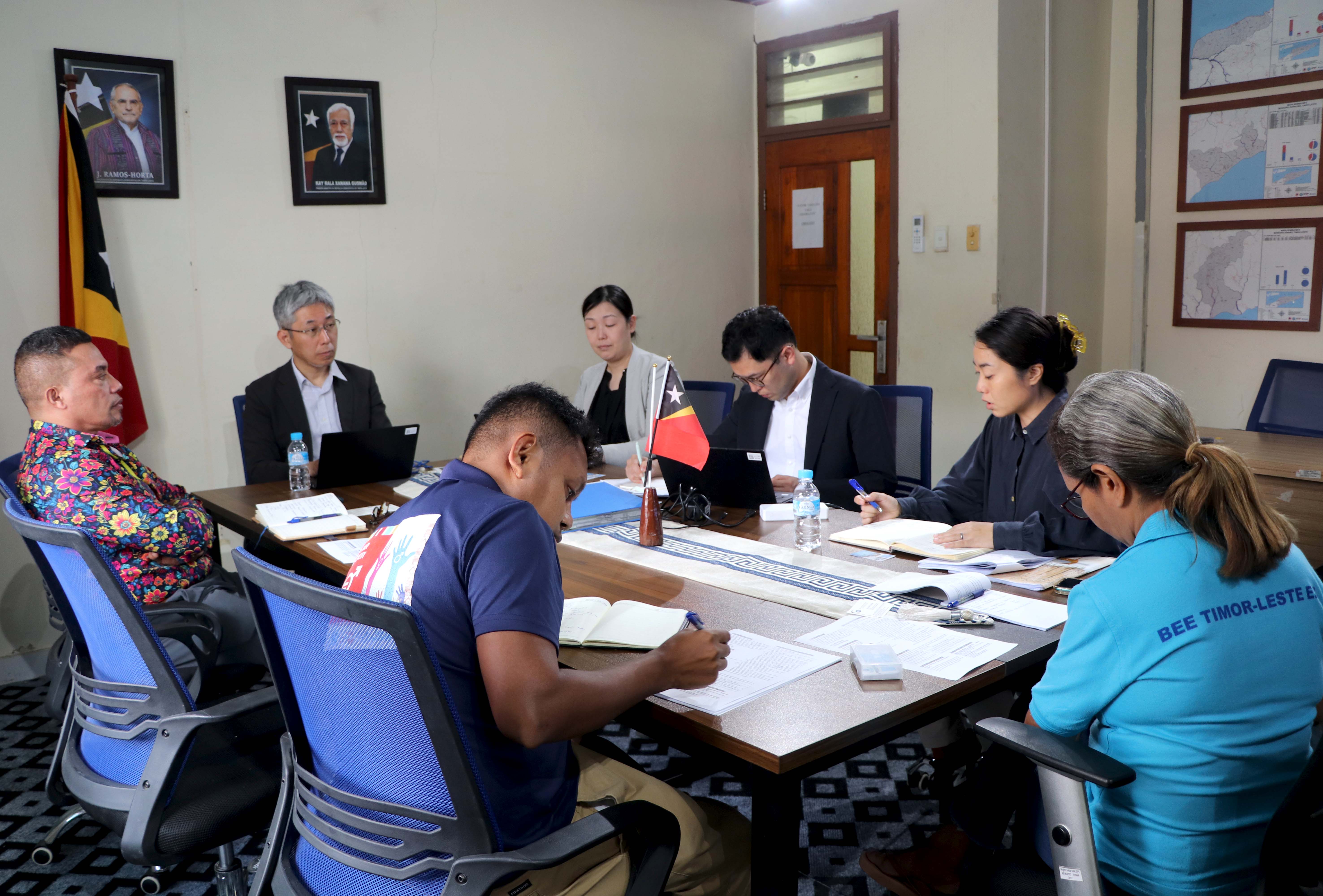 Díli, 21/11/2025. Vise-Prezidente Komisaun Ezekutiva (KE) Bee Timor-Leste, Empreza Públika (BTL, E.P) ba Asuntu Korporativu, Manuel Tomás Amaral de Carvalho akompaña husi Jestora Rekursu Umanu BTL, E.P nian, hala’o enkontru ho ekipa hosi Japan International Cooperation Center (JICE), iha sala reuniaun Ezekutivu, BTL, E.P Caicoli.
